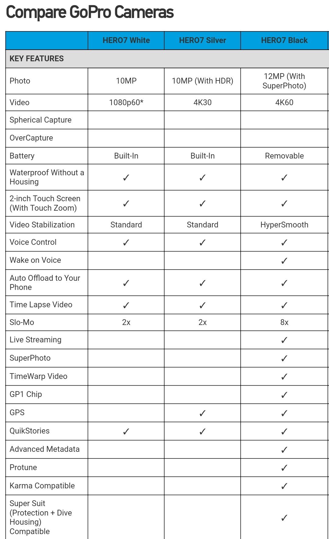 Free SD card with all cameras. Gimbal-like stabilization–without the gimbal. Waterproof down to 33ft (10m). Voice control. HDR photos. Live facebook streaming.